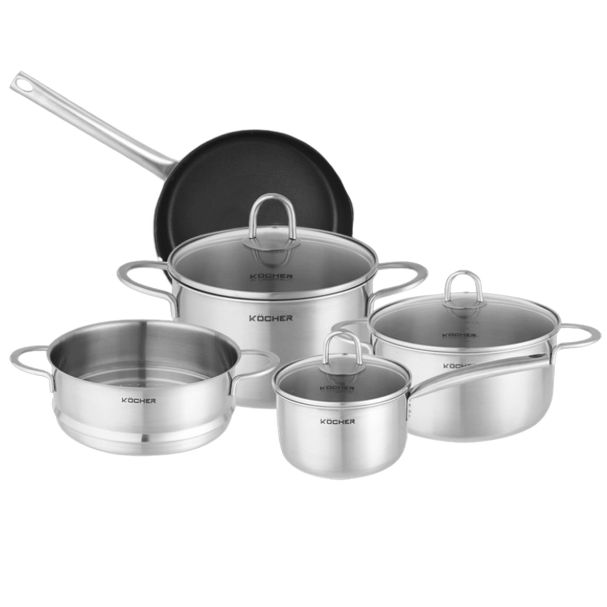 Bộ sản phẩm Kocher Munich 5 món bao gồm nồi lớn, nồi vừa, nồi nhỏ, chảo chống dính và xửng hấp. Nhờ vậy, bạn có thể dễ dàng lựa chọn nồi phù hợp cho từng món ăn – từ việc nấu canh, luộc gà nguyên con, hầm xương cho đến chiên xào nhanh gọn.